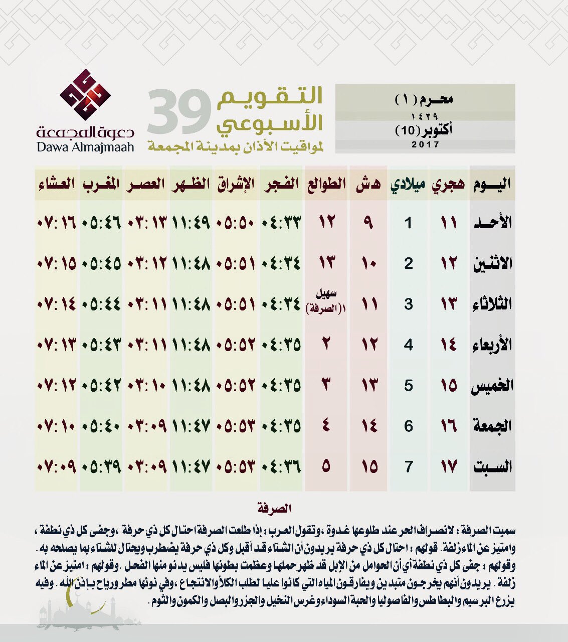 جمعية الدعوة بالمجمعة On Twitter التقويم الأسبوعي لمواقيت الأذان بمدينة المجمعة محرم ١٤٣٩هـ أكتوبر 2017م الميزان ١٣٩٦هـ ش