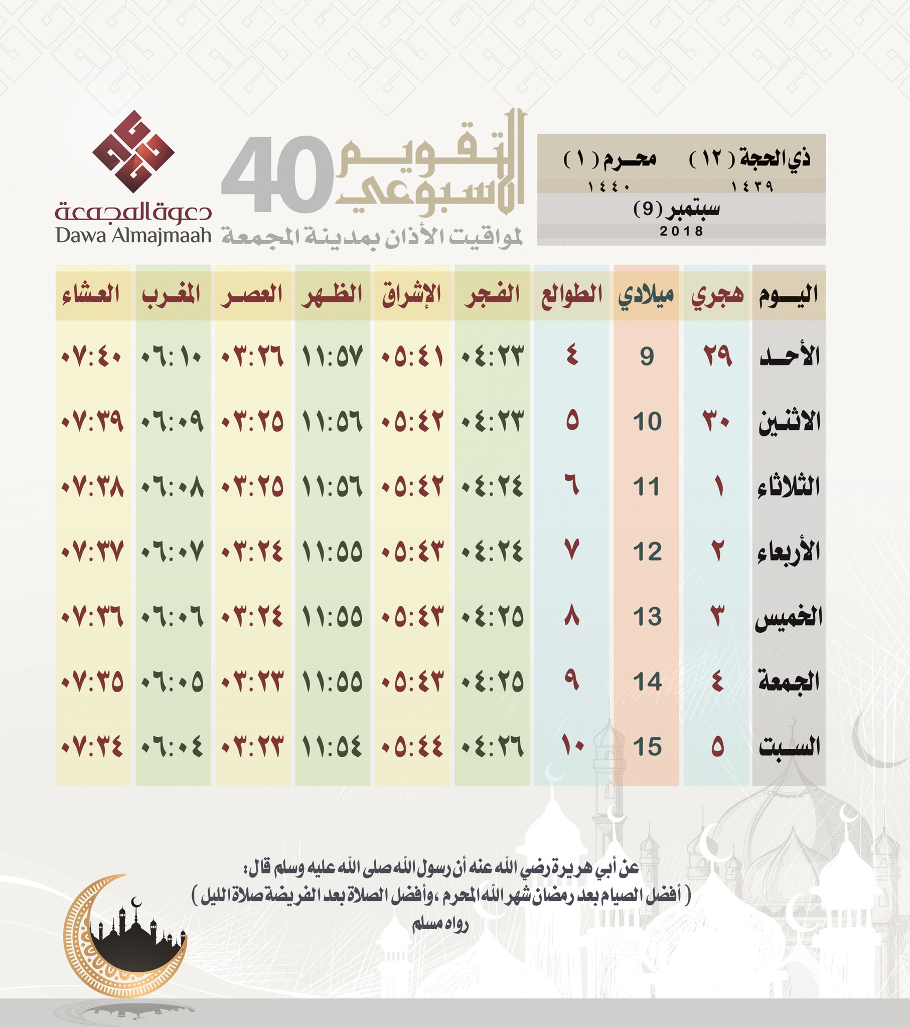 جمعية الدعوة بالمجمعة בטוויטר التقويم الأسبوعي لمواقيت الأذان بمدينة المجمعة حسب تقويم أم القرى محرم ١ ١٤٤٠هـ سبتمبر 9 2018م عام هجري جديد ١٤٤٠ Https T Co Qfj59ckemf