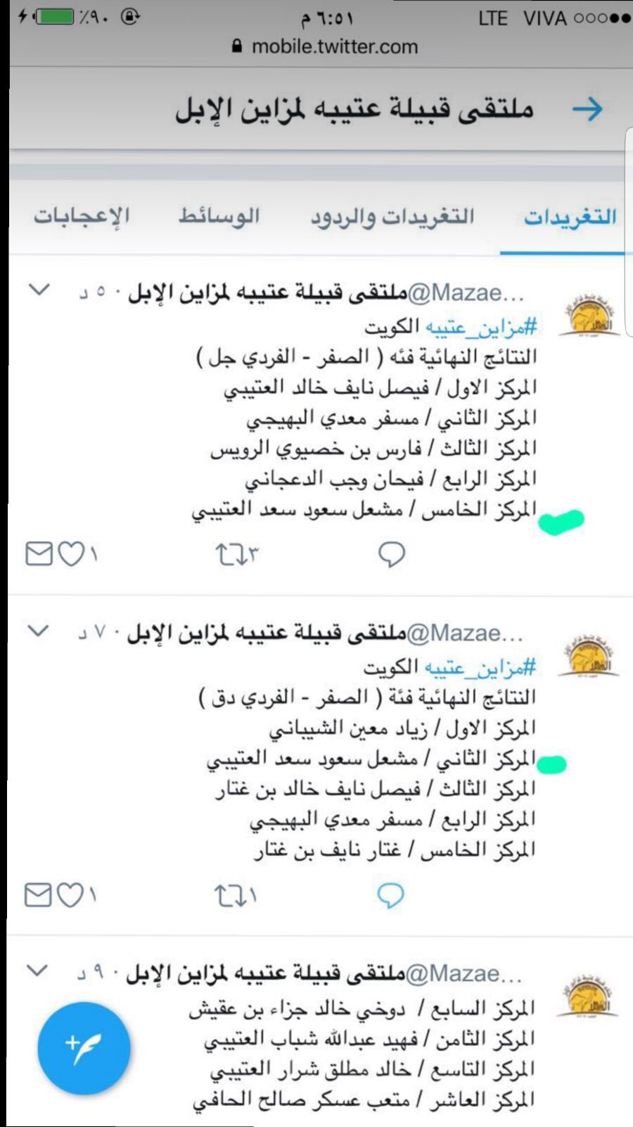 حساب الفلته الرسمي Ar Twitter نبارك لذعار سطام الفليت حصوله على المركز الثامن في مزاين الهيلا للإبل في الكويت لون الصفر فئة 10