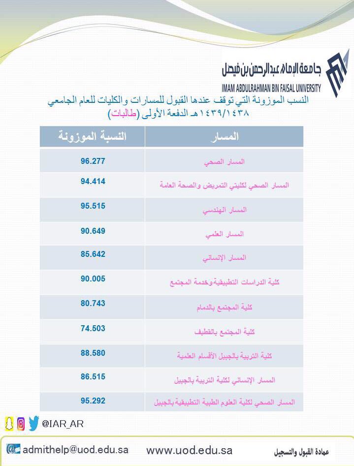 جـ ـامـ ـعـ ـةالإمـ ـام عــبــدالرحـمن بن فيصل On Twitter النسب التي توقف عندها القبول للدفعه الثالثه والاخيرة للطالبات مع تمنياتنا للجميع بالتوفيق والنجاح Http T Co Fyqavdxct7