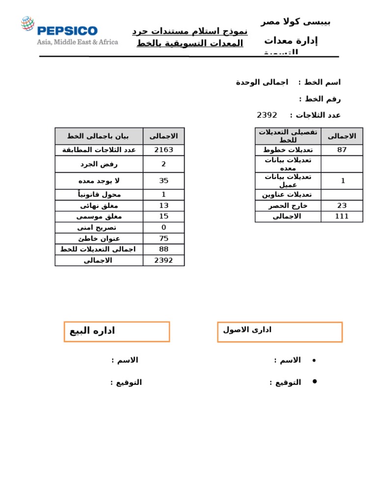 نموذج استلام مستندات جرد الثلاجات بالخط البيعى